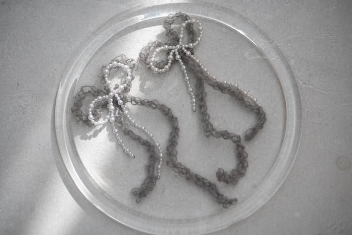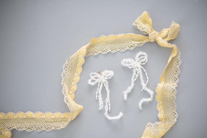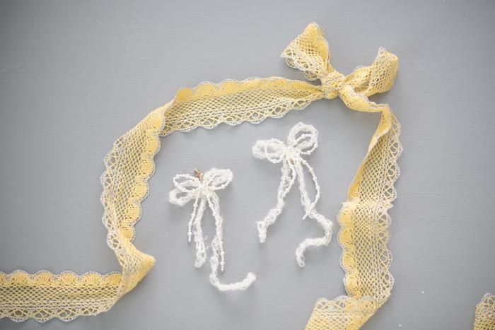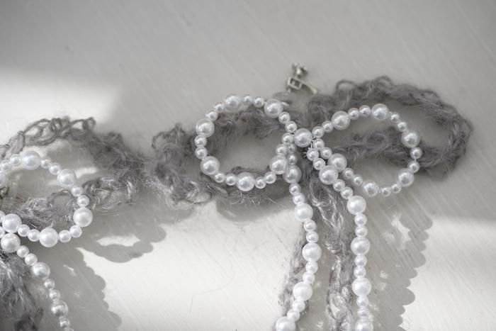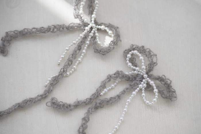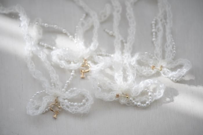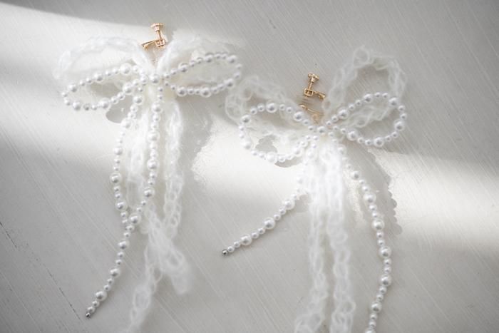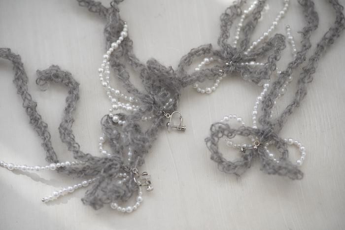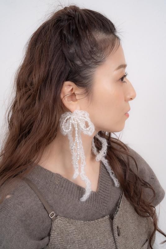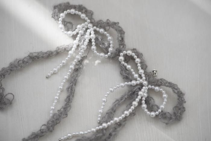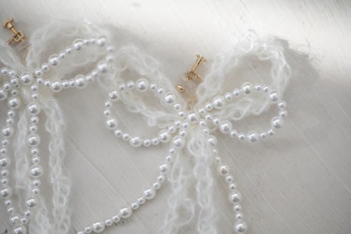 大小の樹脂パールでリボンを作り、モヘアリボンの柔らかさでとても可愛らしい耳元に。