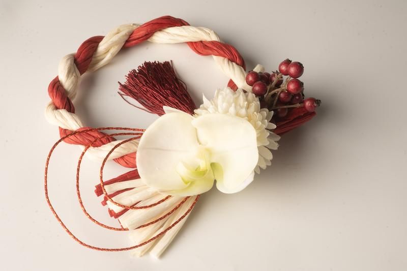 【新年を彩る】 紅白のしめ縄に蘭の花を添えて。福を呼び込む華やかお飾り。